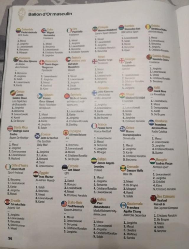首先,作为主办方的《法国足球》杂志,其主编费雷第1名投给了莱万,第2名是梅西,然后是本泽马、若日尼奥和姆巴佩。除了照顾两名法国同胞,费雷的排序可以说非常符合主流和评选的标准。但到了利益相关国,投票似乎就有点变味了。例如,阿根廷评委把票投给了梅西、本泽马、C罗、苏亚雷斯和佩德里,完全无视莱万和若鸟!