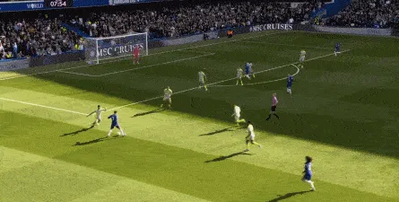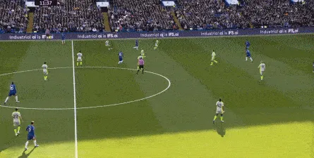 丢球了,切尔西在主场总该有些变化了吧,你不能说没有,这体现在他们的前场逼抢力度稍有提高,但并没有提高到足以干扰曼城后场球员起脚质量的高度,所以曼城反而打出了两次不错的打身后,这就把切尔西又给打回去了: