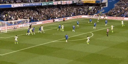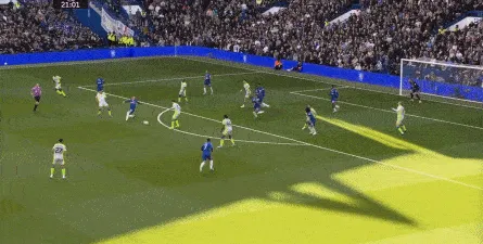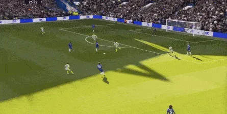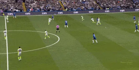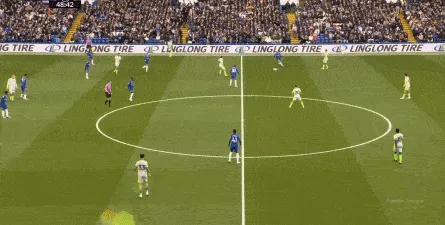 这种情况下,帕尔默和若昂-佩德罗又不能直接从中路打出进攻,也就不能吸引防守重心,从而给边路制造出更大的空间,所以在上半场后半段,切尔西的威胁进攻就变得很少了,这次帕尔默在中路实际失误,但错进错出形成的传中,就是为数不多的机会了: